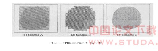 因为ROI区域是不规则的任意形状,解决的方案有三种,分别如下所述:方案A是用一个大矩形框将图像的ROI区域完全覆盖(如图2(1)所示),然后对矩形框内的区域采取高质量压缩,对框外区域采取低质量压缩。这种方法的优点是易于交互式的区域指定操作,压缩实现容易,但是有个很明显的缺点就是效率低下,特别是如果图像的ROI区域呈凹状的时候。 方案B是用若干个小矩形框将图像的ROI区域完全覆盖,然后再分别对各个矩形框内以及框外的区域进行不同质量的压缩。实际应用中,为了易于实现,通常是对图像进行网格状的划分处理,即把图像分成若干个大小相同的“片(slice )”(如图2(2)所示),然后根据图像目标区域的Mask信息,确定哪些slice包含有目标区域,需要进行高质量压缩;哪些不包括目标区域,需要进行低质量压缩。slice选取的大小将决定区域覆盖的精确度,即影响压缩的效率。 方案C是只对图像Mask信息覆盖的目标区域内的数据进行高质量压缩,而对其他区域进行低质量压缩〔如图2(3)所示)。但是,由于目标区域很可能是任意形状的,而普通的离散小波变换、离散余弦变换等都不支持这种任意形状的图像分解,因此该方案需要特殊的图像变换和编码技术才能实现。