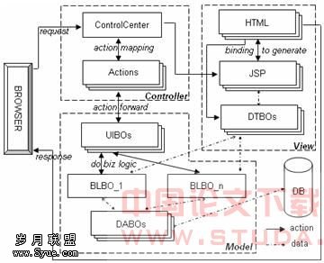 图2 WebPJ-SDK结构模型 该模型根据Struts框架也分成三个部分:控制器、视图和模型。当控制器的ControlCenter接收到来自客户端的请求时,WebPJ-SDK会通过定义的页面迁移关系图module.xml来找到对应的Action,接着由这个Action定位到具体的业务模型入口UIBO,由UIBO调用一组与自己相关的业务处理,即BLBO,处理完后的数据结果集会通过数据模型DABO返回给视图部分的JSP,再由JSP组装后提交给用户端的浏览器。2.2 控制器组件
