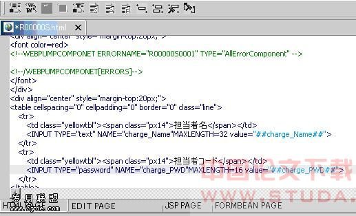 WebPJ使用“## ##”标记对画面上相关的字段进行单个绑定或者循环绑定(多用于表单),如“##charge_PWD##”表示了对画面上用户密码项目的绑定。同时通过识别各类<!--WEBPUMP XXX-->标签来绑定模块,如图5中含有[ERRORS]字样的标签是对提示信息的绑定。绑定完成后点击保存按钮就可以将最新的内容更新到JSP和FormBean的代码中。程序员可以点击“JSP PAGE”和“FORMBEAN PAGE”来查看生成的代码。操作界面如图5所示: