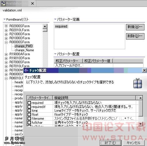 验证组件主要指对数据的合法性检查,而非业务规则。虽然在 FormBean中的validate()方法中可以对部分输入数据进行验证,但这样处理就必须由程序员编写代码来实现对每个字段的合法性验证,如果规则改变,代码必须重写。WebPJ提供了一个验证组件,程序员可以通过配置窗口(如图3),为某个页面的某个字段设置一个复杂的合法性规则。生成的规则会有WebPJ-GUI添加到配置文件validationrule.xml中。同时程序员还可以将验证失败时所显示的提示信息设置到另一个配置文件Application-Resources.properties中。该文件由webpjconfig.xml的<message-resources parameter>指定。