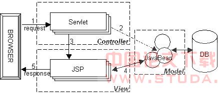 MVC是Model-View-Controller的简称,即模型-视图-控制器。MVC是Xerox PARC在20世纪80年代为编程语言Smalltalk-80发明的一种软件设计模式,至今已被广泛使用,最近被Sun公司推荐为J2EE平台的设计模式[1]。MVC强制性地把应用程序的输入、处理和输出分开。MVC中的三个核心模块:模型、视图和控制器,各自承担不同的任务,具有以下的优点: A) 多个视图能共享一个模型,提高了代码的可复用性。 B) 模型是自包含的,与控制器和视图保持相对独立,所以可以方便地更改应用程序的数据层和业务规则。 C) 控制器可以用来连接不同的模型和视图去完成用户的需求,提高了应用程序的灵活性和可配置性。1.2 JSP Model2