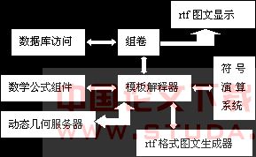 组卷模块接受用户输入,然后通过数据库访问模块查找相应的模板,将各模板交给模板解释器,由模板解释器进行翻译。