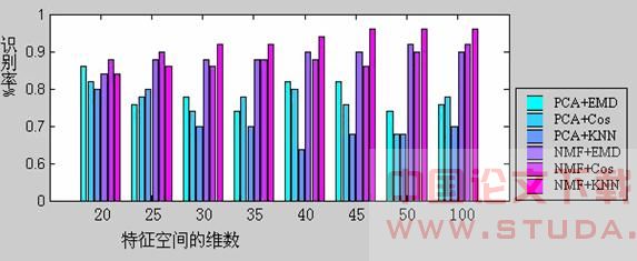 图4 算法的识别率将测试样本图像映射到特征空间求得特征向量。通过求测试样本和训练样本特征向量之间的欧氏距离、Cos距离和三近邻,得出识别率。表1为PCA和NMF得到的识别率(由于NMF的随机性,识别率为重复10次实验得到识别率的均值)。也可参见直方图图4。结果表明,对于每种分类方法,非负矩阵分解算法的识别率都明显高于主成分分析算法。