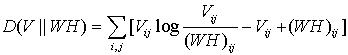 非负矩阵分解[3]问题可描述为:已知一个非负矩阵V,要找出非负的n*r矩阵 W和非负的n*m矩阵H,使 V=WH。由上述可知,非负矩阵分解是用非负性约束来获取数据表示的一种方法。非负性是对矩阵分解非常有效的条件限制,它导致了对于原始数据的基于部分的表示形式,即样本数据只允许加性和非负的组合。算法所得到的非负基向量组 具有一定的线性无关性和稀疏性,从而使得其对原始数据的特征及结构具有相当的表达能力。这使得该算法具有很强的应用背景。 NMF的求解是一个最优化问题,可以用迭代方法求解W和H。NMF 问题的目标函数有很多种,最常用的两种目标函数为KL散度和欧几里德距离。KL散度计算公式如下: