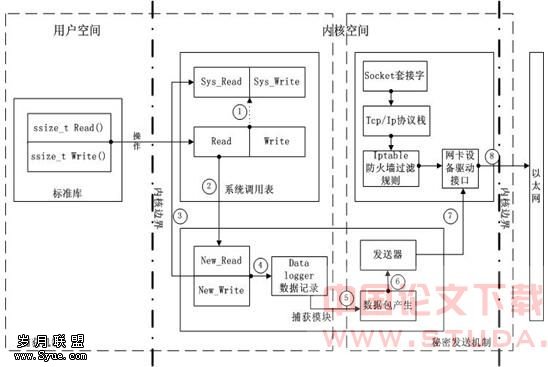 为了观察入侵者使用加密的会话,就必须找到破解加密会话的方法,不过许多组织已经证明这是非常困难的。强攻不行就只能智取,加密的信息如果要使用就肯定会在某些地方不是被加密的,绕过加密进程就可以捕获未加密的数据。这是解密工作的基本机制,然后获得访问未保护的数据。使用二进制木马程序是对付加密的一种办法。当入侵者攻破蜜罐,他可能会使用如SSH的加密工具来登陆被攻陷的主机,登陆的时候肯定要输入命令,这时木马shell程序会记录他们的动作。不过二进制木马程序隐蔽性不高,而且入侵者可能会安装他们自己的二进制程序。 从操作系统内核访问数据将是一个很好的捕获方法。不管入侵者使用什么二进制程序,都可以从内核捕获数据并且可以记录它们的行为。而且,由于用户空间和内核空间是分开的,所以在技术上还可以实现对所有包括root在内的用户隐藏自己的动作。图2中左边的数据捕获机制说明了其工作的原理。 数据捕获是由内核模块来完成的,所以要使用这个模块获得蜜罐机操作系统内核空间的访问,从而捕获所有read()和write()的数据。捕获模块通过替换系统调用表的read()和write()函数来实现这个功能,这个替换的新函数只是简单的调用老read()和write()函数,并且把内容拷贝到一个数据包缓存。见图2中的步骤①、②、③、④。
