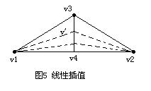 当block的网格分辨率次发生变化时,其网格模型可能变化较大,由于变化是在瞬间完成的,极易被观察者察觉。但如果我们把这种变化由突变改为渐变,用户就不易察觉,其视觉影响也就可以忽略不计。 我们在预处理阶段已经得到一个合适的查找表,可以查出block的网格分辨率c与block到视点的距离d之间的对应关系。我们假设d=1000m时 c=n+1,d=2000m时c=n。 如果现在d=1500m,则网格的分辨率正处在n 和n+1的过渡阶段。我们取网格顶点为c=n+1时的索引,他比c=n时多出一些细节顶点,对这些多出的细节顶点,我们对其高度进行线性插值,使其缓慢在分辨率n+1和分辨率n之间过渡。如图5,v3为高分辨率时出现的细节顶点,v4为模型在低分辨率时v3的初始点。随着网格向高分辨率过渡,v4逐步过渡到v3。v’的Y坐标由下面的公式决定: