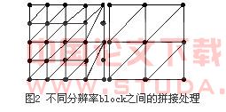 不同的block之间互相拼接时,如果分辨率不同则可能产生裂缝。为了消除裂缝,在较高分辨率的block边界上,忽略一些点作为网格顶点,如图2所示。