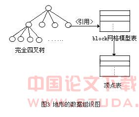 我们首先读入一个场景的DEM数据(高程数据),保存在一个顶点线性表中,然后把这个场景在xz平面上划分成均匀大小的多个block。block的大小按需求而定,其边长满足 ,如9×9,17×17,33×33等。如果地势总体比较平坦,我们可以选得大一点,如果对地形的细节要求较高我们可以选得小一点。本文以19×19作为block的大小。 block通过顶点索引所组成的三角形带描述他负责的一片小的区域。整个场景用一棵完全四叉树把这些blocks组织起来。实时渲染时完全四叉树负责场景的裁剪,决定哪些blocks应该绘制,然后计算可见block的网格分辨率,从而得到整个地形要渲染的三角形面片。其数据组织如图3所示。
