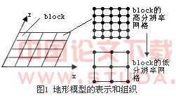 当地形是超大地形绘制时,我们采用[5]的方法,用多线程机制加上场景缓冲的方法实现大地形数据实时动态调入和管理。每一个场景作为动态加载单元,用一个缓冲区来管理,用单独线程来调度。3.2 Block多分辨率网格模型的构造和数据组织
