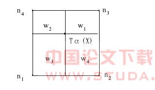 我们将研究的范围限制在二维脑断层图像的配准. 因为脑组织受到颅骨的严密保护,所以脑部运动可以近似为刚体运动,即内部无相对运动. 同时,假设待配准的图像经过预处理后具有相同的空间比例.我们的目标是寻求空间变换T,使MI(T) 最大.。针对前面所做假设,令T = T1*T2;其中,T1 为平移矩阵,T2为旋转矩阵。 最近邻插值法的精确度很低,而双线性插值法会产生新的灰度值。这对于联合直方图的统计是不利的。因为新加入的灰度值使得随着Tα的一些小变动,联合直方图中就会增加新的象素对,或者减少象素对,从而互信息值变化比较大,也就是互信息函数曲线会不光滑,这样不利于优化。因此为了消除新产生的灰度值的不利影响,我们在配准过程中引入了另外一种插值法:PV(Partial Volume)插值法。从产生插值图像这个方面来说,PV 插值法不能算是一种插值方法,它是专门针对联合直方图的更新而设计的。和双线性插值法一样,PV 插值法也是利用点Tα(X)的四个最近邻点和权值 ,可是,不同于双线性插值法的是,PV 插值法不是根据最近邻点的加权平均所得到的灰度值,从而更新联合直方图,而是根据权值 使周围四个象素点都贡献于联合直方图的统计,如图1所示。可用公式表示为: