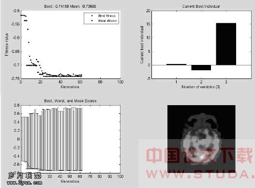 图2 提取Harris 图3 提取Harris角点后的CT图 角点后的PET图 本程序应用遗传算法做变换参数的搜索,根据提取的角点处的局部子块计算互信息(如提取了角点的CT图的角点局部子块与原未提取角点的PET图计算互信息),找出变换后两幅图像互信息最大的变换参数。图4为配准过程及结果的效果图。