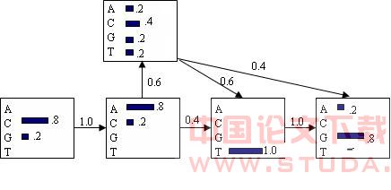 隐马尔科夫模型[3](Hidden Markov Models,HMM)是一种概率论模型,这种方法已经成功应用于多个领域,如语音识别、光学字符识别等。HMM在生物信息学领域中也有着重要的应用,如序列分析、基因识别等。目前,基因识别的HMM方法也大致可以分为两类,一类为按照内容搜索的方法,通过核苷酸和三联密码子等在编码区的分布来界定蛋白质的编码区;另一类为按照信号搜索的方法,通过编码区周围的信号界定蛋白质编码区。2.1 马尔科夫链