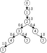对于给定一个隐马尔科夫模型M=(A,S,Q)和一个字符序列X(即基因序列),在M中寻找产生该序列的最优路径Π*,该路径从起始状态出发,结束于终止状态,在路径中的每一个状态都选择释放一个字符,使P(X|Π*)最大。这是基因识别中常用的一个方法,这里我们设计采用并行算法来求解HMM的最优路径问题。 给定一个字符序列X=(x1,x2,…,xL),以vk(i)代表序列前缀(x1,x2,…,xL)终止于k(k∈S,1≤i≤L)的最可能路径的概率。求解过程如下: (1)初始化 vbegin(0)=1k≠begin vk(0) = 0 (2)对于每个i=0,1,…,L-1及每个l∈S,按下式进行递归 vl(i+1) = el(xi+1)max{vk(i)fkl} k∈S (3)最后,计算序列X终止于状态“end”最可能的路径概率,即P(X|Π*)的值 P(X|Π*) = max{vk(L)fk,end} k∈S 在实现中我们将隐马尔科夫模型使用一颗状态空间树及一个字符释放概率矩阵联合表示。如图2所示。