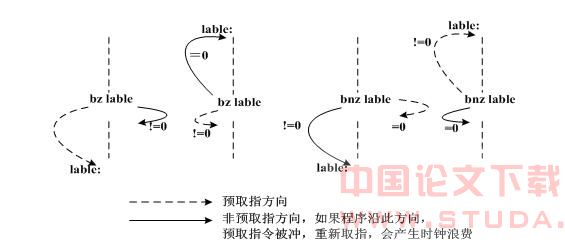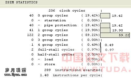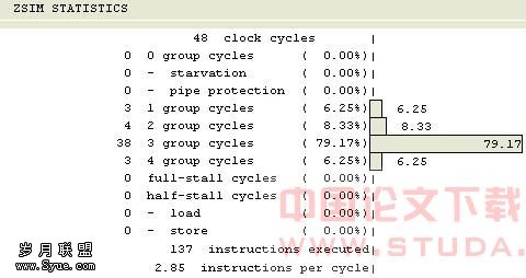 跳转指令会导致流水线的中断等待状态,ZSP核不知要到哪个分支取指令,为此ZSP500中的跳转指令设置了跳转预测功能[3],如bz lable指令有向前预取指令的功能,如果lable标签存于bz 指令下方,则程序将预取以lable标签开始的汇编指令,如果lable标签存于bz指令上方,则程序预取紧跟bz指令的汇编指令,而bnz指令则向后预取指令,具体如图3 bz bnz指令预测方向图所示[8],其他如bge、ble、br等指令预测方向皆不相同,满足编写程序的需要。有此预测功能,编写汇编程序时就要将发生几率最大的程序块放在跳转指令预测方向,减少由于跳转预测错误而引起流水线被冲,重新取指而带来的ZSP核的等待。3.2.4特殊硬件资源和指令资源的利用 ZSP500可以通过控制寄存器的设置开启四个数据缓冲区,此四个数据缓冲区采用比特反转寻址,并且当指向缓冲区底部时,会自动回转到缓冲区顶部,这种性能在应用ZSP500进行FFT算法实现时可以达到很好的效果。在软件设计上很难达到的速度优化效果,应用硬件特殊的物理器件功能,就变得十分容易实现了。同时ZSP500还提供特殊的汇编指令资源,如复合指令cmaci、cmuli,功能指令max、min等,其中max可以实现取两个数据的较大者,min指令可以实现取两个数据的较小者,特殊指令的应用,可以避免跳转指令、比较指令的使用,减少跳转指令预测错误造成的时钟浪费[8]。如: if (var2 < -32) var2 = -32 ; else if(var2>32) var2 = 32 ;对应的汇编指令: mov r0, -32 mov r1, 32 !!r2 = var2 max r2, r0 !!取比-32大的数 min r2, r1 !!取比32小的数 以上汇编程序没有跳转指令的应用。 以上详细分析了各种汇编优化策略,在具体的项目工程中要充分的应用以达到优化效果的最大化,程序各种优化方法的使用要结合硬件资源,在硬件资源足够的情况下合理的使用。以一段完整的程序优化为例:C代码如下: if(var1 = var2) //利用跳转预测的方法优化 {for (i = 0,n=0;n < 80; n=i+2,i++) c[i] = a[n]*a[n] + a[n+1]*a[n+1]; //利用软流水的方法优化 if (var2 < -32) var2= -32 ; //利用ZSP500提供的特殊指令优化 else if (var2>32) var2 = 32 ; c[41] = var2;} else{for(i = 0;i < 41 ;i++) c[i] = 0;} //利用循环优化 综合利用以上提供的优化策略和代码,整体进行汇编语言的编写和调整,程序执行的效率可由ZSP IDE中的统计工具ZSIM SRTATISTICS统计得出,由图4可以看出C源程序采用三级自动优化后耗费时钟206 clock,效率1.40 IPC,每时钟周期执行两条指令居多59.22%,由图5可得采用手工汇编并优化后整体耗费时钟48 clock,效率2.85 IPC,单时钟执行三条指令居多达79.17%,大大提高了程序的执行效率,优化后整体没有流水线保护、停顿状态(0 group cycle = 0),优化后程序执行速度提高了3倍。