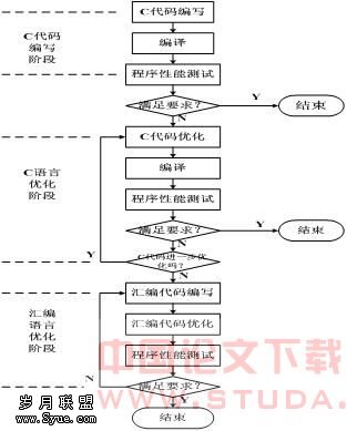 程序优化总体原则:基于ZSP500的硬件资源,根据指令分组原则[3]编写简洁、高效的汇编指令,能够长时保证流水线的充满,充分发挥利用ZSP500强大的运算功能。评价标准:硬件资源的利用率和每时钟周期实际指令执行条数。 优化流程:基于ZSP IDE集成开发环境,测试纯C语言工程的执行效率,开发环境的设置上我们可以开起开发环境的自动优化选项-03级优化,这样开发环境可以对C语言程序自动进行三级速度优化[2],在这种设置下,根据开发环境提供的工具,测试寻找程序耗时较高的程序段或子函数,进行C语言级的优化,优化完毕后,测试优化结果,如果满足目标要求,则优化任务完成。如果不满足要求要求,则要进行汇编级程序优化,这时我们要将耗时较高的函数或程序段进行手工汇编并进行优化,直至满足优化要求。通常情况下,汇编程序的优化效果比较明显,也是优化要求能否达到的关键,整个流程如图2所示。3.1 C语言的优化