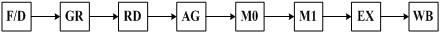 ZSP500是针对3G和多媒体应用而设计的,在内存、功耗、性能方面有着优秀的表现,它是基于RISC的超标量架构,其硬件规划可以根据分组原则确定每个时钟周期要执行的指令条数,并且ZSP500具有静态分支预测功能,可以减少分支跳转惩罚,ZSP500的指令集简单、易懂,条件执行可以执行多达8条相邻指令,可以减少分支,加速数据依赖算法的实现等等。ZSP500的内核是一个四通道超标量、双MAC的数字信号处理器,时钟频率250MHz,拥有16个16位通用寄存器,相邻的两个16位寄存器可以合并为32位寄存器,与8个相应的8位引导寄存器可构成40位通用寄存器,8个32位基址寄存器,一个时钟周期最大可以执行64位数据的读取,双MAC可以达到每秒500M的MAC操作,同时具有双算术逻辑单元(ALU0,ALU1),双地址生成单元(AGU0,AGU1)[2][3][4]。 ZSP500指令执行的8级流水线线分别为取指/译码(F/D)、指令分组(GR)、读书据(RD)、地址生成(AG)、内存连接0(M0)、内存连接1(M1)、执行(EX)、数据写回(WB)[3],如图1所示。熟悉指令各个流水线阶段数据和寄存器内容变化的时序,可以规避各种数据和资源的冲突,保持流水线长时充满,硬件资源充分利用,程序高效、稳健。