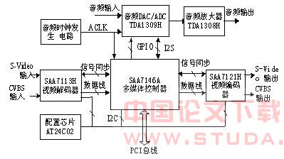 视频采集播放卡由多媒体控制器SAA7146A、视频编码器SAA7121H、视频解码器SAA7113H、音频编解码器TDA1309H、音频放大器TDA1308以及AT24C02等芯片组成,具体如图2所示。