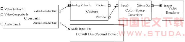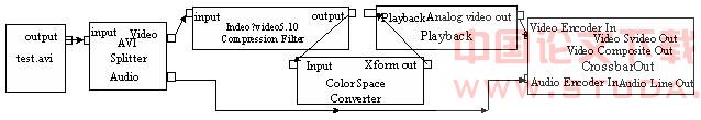 图5所示为视频采集播放卡播放输出上述采集的AVI格式视频文件的Filter Graph,由于SAA7146A BRS只能接收UYVY格式的视频数据,因此需要增加了一个Color Space Converter Filter来实现RGB24到UYVY格式的转换。
