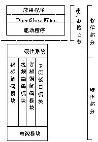 视频采集播放卡由硬件和软件两部分组成,如图1所示。硬件部分包括PCI接口模块、音频编解码模块、视频解码模块、视频编码模块以及电源模块等。软件部分包括驱动模块和应用程序模块。驱动模块属于底层的软件接口,主要为上层的应用程序提供硬件调用接口。