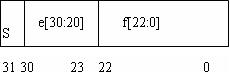 IEEE单精度浮点格式共32位,包含三个构成字段:23位小数f,8位偏置指数e,1位符号s。将这些字段连续存放在一个32位字里,并对其进行编码。其中0:22位包含23位的小数f; 23:30位包含8位指数e;第31位包含符号s。如图1所示。