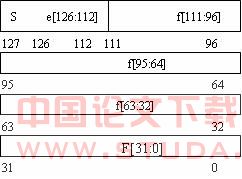 ⑴ 扩展双精度格式(SPARC 结构计算机) 该4倍精度浮点环境符合IEEE关于扩展双精度格式的定义。该浮点环境的4倍精度浮点格式共128位,占4个连续32位字,包含3个构成字段:112位的小数f,15位的偏置指数e,和1位的符号s。将这4个连续的32位字整体作为一个128位的字,进行重新编号。其中0:110位包含小数f;112:126位包含偏置指数e;第127位包含符号位s。如图3所示。在SPARC结构计算机中,地址最高的32位字存放小数的32位最低有效位,即f[31:0];但是在PowerPC结构计算机中,却是地址最低的32位字存放这些位。紧邻的两个32位字(在SPARC机中向下计算,在PowerPC机中向上计算)分别存放f[63:32]和f[95:64]。 最后一个字的第0到15位存放小数的最高16位,即f[111:96]。其中第0位存放该16位的最低有效位,第15位存放整个小数f的最高有效位。第16到30位存放15位的偏置指数e,其中第16位存放偏置指数的最低有效位,第30位存放它的最高有效位。最高位,第31位存放符号s。