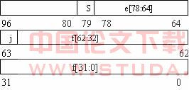 图 3 扩展双精度存储格式 (SPARC 结构计算机) ⑵ 扩展双精度格式(Intel x86结构计算机) 该浮点环境双精度扩展格式符合IEEE双精度扩展格式的定义。该浮点环境的扩展双精度格式共80位,占3个连续32位字,包含四个构成字段:63位的小数f,1位显式前导有效位(explicit leading significand bit)j,15位偏置指数e,和1位符号位s。将这3个连续的32位字整体作为一个96位的字,进行重新编号。其中0:63包含63位的小数f,第63位包含前导有效位j,64:78位包含15位的偏置指数e,最高位第79位包含符号位s。 在Intel结构系计算机中,这些字段依次存放在十个连续的字节中。但是,由于 UNIX System V Application Binary Interface Intel 386 Processor Supplement (Intel ABI) 要求双精度扩展参数,从而占用堆栈中3个相连地址的32位字,其中最高一个字的高16位未被使用,如图4所示。