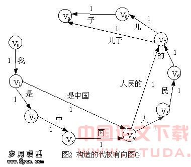 整个算法实验过程中,正向与逆向所用数据字典是segmenter程序提供的一个基本词典,共有词量195580条。经过对含有汉字串:“我是人民的儿子”与“我是一个深深爱着祖国和人民的好儿子”进行实验,以及一个大小为6kb的文本文件进行实验,结果如下: 对于汉字串1:正向正大匹配算法结果集{我,是,中国人民,的,儿子};逆向最大匹配算法结果集{我,是中国,人民的,儿子}。 叠加算法求得结果集{我,是中国,人民的,儿子}。 最终构造的有向图,如图2。