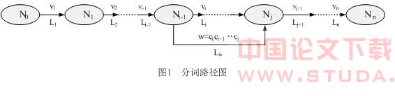 用给定的字符串构造非负权图的方法如下所述: ①对于给定语句S(从构成来看由许多单字组成,而表达的意义是由多个语义单位构成); ②根据提供的统一分词词典,按照正向最大匹配算法找出字符串中所有可能的语意对象或者词,求得构词集Vd={vd1,vd2,…,vdn}; ③如同②,按照反向最大匹配算法找出字符串中所有可能的语意对象或者词;求得构词集Vr={vr1,vr2,…,vrn}; ④对②与③的构词集Vd与Vr按照本论文算法进行叠加运算,连同语句中所有的单字集Vs取得无负权图所有构词集V={v1,v2,…,vn},边权值定义为wij=1(i,j=1,2,…,n); ⑤在相邻节点Nk-1,Nk之间建立有向边<Nk-1,Nk>,边的长度值为Lk,边对应的词默认为vk(k=1,2,…,n); ⑥若w=vivi+1…vj是一个在V中的词,则在节点Ni-1,Nj之间建立有向边<Ni-1,Nj>,边的长度为Lw,边对应的词为w(0<i<j≤n)。 在本论文中,边的长度Lk(k=1,2,…,n)统一赋值为1。由上述方法构造的非负权图如图1所示。