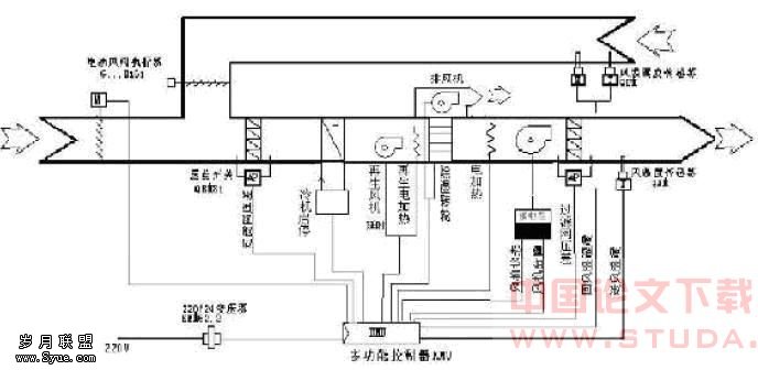 控制系统在除湿间送风口附近和回风管道中分别安装QFM3 160温湿度传感器,监测送、回风温湿度。实际系统中,经过充分混合的回风口温湿度应该与除湿间温室度最接近,故将其作为控制温湿度目标,即此温湿度传感器受控。控制系统的效果和精度不仅依赖于控制系统的电气特性,在很大程度上还依赖于控制方案的设计、执行机构的选择以及控制模式和参数的确定等因素。 (1)温度控制:根据回风温度控制制冷机和电加热。实际温度高于控制器设定值,制冷机开;实际温度低于控制器设定值,冷机关,电加热开。 (2)湿度控制:根据回风湿度控制除湿机。实际湿度高于控制器设定值,除湿转轮开,实际湿度低于设定值,除湿转轮关。 (3)再生风机和再生电加热的控制:根据送风湿度和回风湿度差值判断除湿机的除湿效果。湿度差值很小,则判断除湿效果好,可以启动再生风机和再生电加热;差值大于设定值时,关闭再生电加热,同时延时一段时间关闭再生风机,以便带走余热。 (4)过滤器检测:在初效和中效过滤器上分别安装压差开关,监视过滤网的吸尘效果,根据压差判断过滤器是否堵塞,并在控制器上报警,提示采取措施。 (5)风机状态检测:监控风机运行状态(如开启/关闭,正常/故障等),根据运行状况提供相应保护措施。在风机停止或故障停止,控制器报警,提示风机故障,同时立即停止所有受控设备,保护空调机组。 (6)风阀和风机联动:风机运行,风阀开启;风机停止,风阀关闭。2.2 系统构成