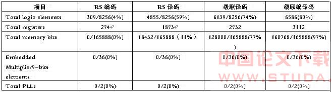 本文RS(255,223)编译码器的设计通过Altera公司的QuartusⅡ软件开发平台上完成了功能仿真、编译综合并优化、布局布线、时序仿真等工作。本文选用CycloneⅡ系列器件的EP2C8T144C8,分别将上述译码器实际占用FPGA资源情况如表1所示。表1 编译码器片内资源占用情况