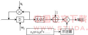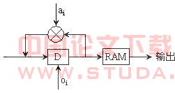 以上的计算是并行计算的,我们在处理中,为了节省硬件资源而采用串行计算,需要把每次迭代的数储存起来,在这里使用了一个片内RAM,实时更新里面的内容,同时RAM的数据地址表示移位次数。当σ1~σ16都移位完成之后,输出RAM数据为0的数据地址即移位次数表示错误位置。改进的串行计算部分电路图如图8所示。