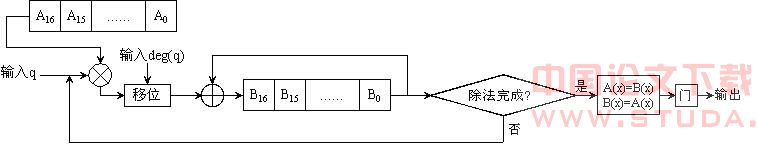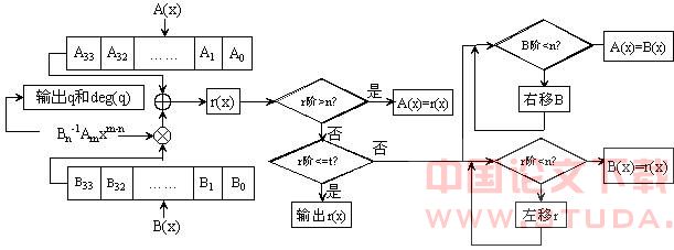 图4 伴随式计算电路3.5.2关键方程求解的实现 在欧几里德(Euclid)算法[3]中,用到了多项式的除法和乘法运算,为了节省资源,必须利用一个有效的刷新办法对该除法器和乘法器进行实时刷新,使得每进行一次迭代后,除法器和乘法器中的内容及时更新,我们把[3]中的算法结构上做如下的改进:在做多项式除法和乘法之前,先进行数据的并串转换。这样只要一个多项式除法器和一个乘法器就可完成该算法,在保证运算速度的同时也最大限度地节省了硬件资源。在下面的部分给出这两个模块的实现。 1) 多项式除法器 假设多项式A(x)除以B(x)的商为q(x),余数为r(x)。若某次迭代时A(x)的阶数为m,B(x)的阶数为n,m≥n。由多项式除法原理可知,q(x)=Bn-1Amxm-n,每次同m-n一起输出;而r(x)=A(x)-B(x)q(x)是一个降次的过程,每降一次都需要将A(x)用r(x)刷新,直到它的阶数小于B(x)的阶数时,表明此次除法运算结束,用B(x)和r(x)分别对A(x)和B(x)进行同步刷新,继续进行下一次除法运算。当r(x)的阶数小于或等于t时,算法中的除法迭代运算结束。在实现中有两点需要注意:第一点是我们用两组固定长度的寄存器来存放A(x)和B(x)的系数,除了第一次初始化的时候需要给出它们的阶数外,以后每次它们的阶数都是由r(x)或上一次的B(x)的阶数直接赋值,而由于每次r(x)是串行得到的,其阶数能通过判断每次的值是否为零累加得到;第二点是每次在对存放B(x)系数的寄存器进行更新时,应将B(x)的最高位和A(x)的最高位对齐,从而方便r(x)的求解,同时在用B(x)对存放A(x)系数的寄存器进行更新时应注意该操作带来的影响。整个多项式除法器的实现如图5所示。 2) 多项式乘法器 多项式乘法器:将多项式除法运算的结果q和deg(q)实时输入多项式乘法器,A(x)赋初值1,B(x)赋初值0,每完成一次除法运算,多项式除法器模块给此模块一个控制信号,A(x)与B(x)互换。迭代运算时代门关闭,输出无效;当除法迭代结束时,多项式除法器模块的控制信号控制门打开,输出有效。多项式乘法器如图6所示。3.5.3钱搜索计算错误位置的实现在工程上,钱搜索过程可用图7所示的电路实现,它的工作过程如下: (1) t个寄存器寄存σ1,σ2,…,σt,当错误个数γ<t,则σγ+1=σγ+2=…=σt=0。 (2) rn-1正要从缓冲存储器读出之前,t个乘法器由移位脉冲控制乘法运算,且σ1α,σ2α2,…,σtαt存在σ寄存器中,并送入A中进行