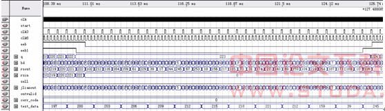 (1)选取具有代表性的测试数据序列,把编码结果与matlab计算结果比较完全正确。 (2)把编码器与译码器级联,确认译码器输出结果完全正确。 (3)将编码器一组输出码字的任意16位出错作为译码器的输入,经过仿真16位均被纠正。 (4)实现卷积(4,3,3)与RS(255,223)级联,确认输出结果正确。如图10所示,为卷积(4,3,3)与RS(255,223)级联的仿真图。图中rsin为RS编码器输入,rsout为编码器输出,jlianout为RS(255,223) +卷积(4,3,3)级联编码输出,corr_code为RS(255,223) +卷积(4,3,3)级联译码输出。