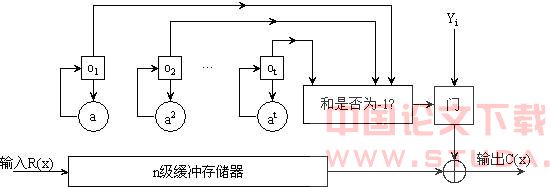 运算和检验。若等于-1,则A输出一个信号,控制门打开,把错误值Yn-1与缓存器输出的rn-1相减,得到rn-1-Yn-1=cn-1。 (3) rn-1译完后,再进行一次相乘,此时σ1α2,σ2(α2)2,…,σt(αt)2存在σ寄存器中,并在A中进行相加运算和检验,对rn-2进行纠错。 (4) 其余码元同(2)一样纠错。