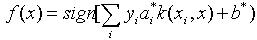 (7) 解决非线性可分的样本的分类问题正是SVM算法的一个优势。利用核函数引入隐非线性变换,将输入映射到高维特征空间,从而转化为线性可分问题。此时响应的分类函数变为