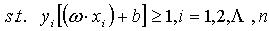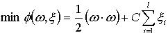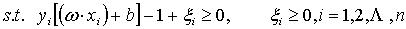 (4) 在线性不可分的情况下,在条件(2)中增加一个松驰项 。即折衷考虑最少错分样本和最大分类间隔,原问题转化为: