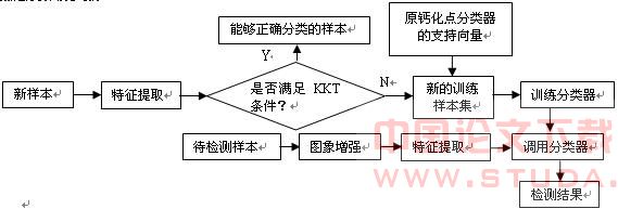 (9)若新样本满足KKT条件,则说明新样本能够被正确分类,则新样本不是支持向量;若新样本不满足KKT条件,则说明该样本有可能是支持向量; (3) 将不满足KKT条件的新样本与原分类器的支持向量一起构成新的训练样本集,重新训练得到新的分类函数。从而获得分类器的更新。4 基于增量SVM的可继续学习微钙化点检测算法及实验结果