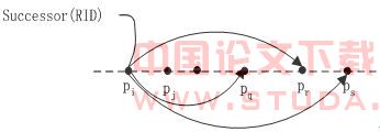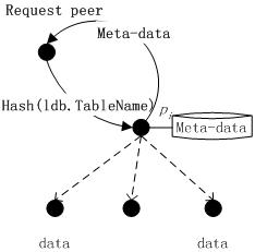 图3 资源定位 在DHT P2P中利用3.1节所述的索引机制,资源定位过程如图3所示。首先,根据关系表名出Hash(LDB.TableName)=RID,RID是分层索引的关系表标识;随后,根据P2P网络路由算法,定位到Successor(RID)节点,该节点存储了关系表LDB.TableName的定位元数据;最后,数据请求条件和关系表子集标识(也就是副本分割条件和副本标识)相比较,返回相关副本的定位元数据<LDB,RID,rl,NodeID,IP>,数据请求节点利用这些元数据可以直接定位到存储了相关副本的节点。 下面以查询处理和DHT Chord路由算法为例,说明该资源定位过程假设查询语句如下:Select a1,a2,a3 from LDB.R Where Cond1 or Cond2 在此查询语句中,需要确定LDB.R表示的副本所在的节点。步骤如下: ①Hash(LDB.R)=RID(这里我们假如等于Successor(RID) =pi); ②根据Chord路由算法定位到节点pi,节点pi存放了定位LDB.R副本所需元数据; ③查询条件Cond和分割规则rule进行比较,假如cond∩rule≠Φ,那么把该rule 对应的<LDB,RID,rl,NodeID,IP>传递给查询发起节点p;cond∩rule≠Φ说明关系表副本按cond进行分割,并且分割后形成的副本R={R1,R2,…RK}可以重构R,即 ; ④否则,把所有的副本对应的<LDB,RID,rl,NodeID,IP>传递给查询发起节点p。cond∩rule≠Φ表示关系表没有预先按cond进行分割,因此所有副本都可能和查询处理相关。在这种情况下,可以考虑使用3.1节数据复制方法进行处理。 数据资源定位实质是对Successor(RID)后继节点的元数据集进行搜索、匹配,并把搜索结果返回请求节点的过程。 本文描述了一种P2P分布式环境下的数据库的实现机制。利用数据分割和数据复制,把节点负载分散,达到系统负载均衡和提高可用性,建立一种分层索引机制使得数据请求节点可以高效的资源定位,支持复杂的查询机制。P2P分布式环境下的数据库的实现机制弥补了DHT P2P网络在管理复杂数据上的缺陷。[1] I. Stoica,R. Morris,D. Karger,M. F. Kaashoek,and H. Balakrishnan; Chord: A scalable peer-to-peer lookup service for internet applications; in Proc. SIGCOMM,San Diego,CA,Aug. 2001,pp. 149-160[2] I. Tatarinov,Z. G. Ives,J.Madhavan,A. Halevy; The Piazza Peer Data Management; ACM SIGMOD Record,Volume 32,Issue 3,September 2003,pages 47-5[3] W. Siong; Ng Beng; Chin Ooi; PeerDB: A P2P-based System for Distributed Data Sharing,Proceedings of the 19th International Conference on Data Engineering (ICDE’03) 1063-6382/03 17.00 © 2003 IEEE[4] L.G.ALEX SUNG,A Survey of Data Management in Peer- to-Peer Systems,Web Data Management,Winter 2005,Pages 1-50[5] R.H.Joseph,Querying the Internet with PIER,Proceedings of the 29th VLDB Conference,Berlin,Germany,2003[6] Roscoe,S. Shenker,I. Stoica,A. R. Yumerefendi;The Architecture of PIER: an Internet-Scale Query Processor;Proceedings of the 2005 CIDR Conference[7] W. Nejdl,B. Wolf,Changtao Qu,EDUTELLA: A P2P Networking Infrastructure Based on RDF,ACM 1581134495/ 02/0005[8] 凌 波,陆志国,黄维雄,钱卫宁,周傲英. PeerIS:基于Peer-to-Peer的信息检索系统. 2004软件学报,l.15,No.9