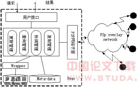 Peer-to-Peer(P2P)环境下的数据管理和共享是数据库领域的研究热点,焦点问题集中在如何使得P2P支持复杂语义数据管理功能,提供数据资源复制、索引和精确的资源定位机制。 基于P2P数据管理系统PeerDB[3],UC Berkeley大学的PIER[5],Edutella[7],Pizaa[2],这些系统不同程度实现了数据共享。PeerDB基于关键字模式映射很难做到准确性,需要过多人为管理; PIER引入名称空间(Name Space)对数据进行索引,但仅仅支持关键字精确匹配查询。Edutella利用超节点描述其辖域子节点共享资源,超节点容易成为瓶颈,不利于系统的扩展。 本文以结构化DHT P2P 网络Chord[1]作为分布式平台,探讨一种广域网环境下P2P数据库的实现机制。首先,对数据使用规则进行分割,并复制到网络中去,提高系统的可靠性和处理的并行性;为避免Hash对数据语义的破坏,利用元数据对副本进行标识、索引;最后,把这些索引元数据组成一种分层索引机制使得数据请求节点可以高效地进行资源定位。体系结构
