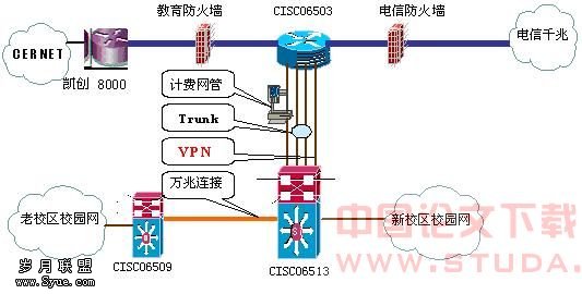 我校共有两个校区:老校区和新校区,两个校区之间通过新校区的Cisco6513和老校区Cisco6509万兆相连,Cisco6513又与边界出口Cisco6503相连。网络拓扑图如下(图1): 针对网络从IPv4向IPv6演进过程中面临的IPv4和IPv6相互之间的通信以及如何实现IPv6网络与现有IPv4网络无缝连接等问题,所以我校在网上采用隧道技术、双栈技术和地址头翻译技术实现对ipv6的互访,即借助当今纯熟的ipv4技术,对ipv6数据包实行ipv4格式的封装与解封装。 我校实际的ipv6配置如下: 在核心设备6573的ipv6配置如下:interface GigabitEthernet12/47description cumt ipv6 linkipv6 address 2001:DA8:100D:1::2/64 // 6513与6503的三层对接ipv6地址的配置interface Vlan12no ip redirectsipv6 address 2001:DA8:100D:2::1/64 // ipv6的vlan配置ipv6 enable //在Cisco6513上启动ipv6协议ipv6 route ::/0 2001:DA8:100D:1::1 // ipv6默认路由配置在出口设备Cisco6503上的ipv6配置如下:interface GigabitEthernet3/47ipv6 address 2001:DA8:100D:1::1/64 // 6503与6513的三层对接ipv6地址的配置ipv6 route 2001:DA8:100D::/48 2001:DA8:100D:1::2ipv6 route ::/0 2001:DA8:A3:F00B::1 ipv6 unicast-routing // ipv6的路由配置interface Tunnel0 //ipv6隧道配置ipv6 address 2001:DA8:A3:F00B::2/64 //源端的ipv6地址 ipv6 enable//启动ipv6协议tunnel source 202.119.200.129 //隧道源端ipv4地址tunnel destination 202.112.53.38 //隧道目的端ipv4地址tunnel mode ipv6ip //隧道模式为ipv6 网防火墙上的配置如下:access-list 102 extended permit ip any host 202.119.200.129 //允许校内及校外的访问通过ipv6隧道 目前ipv6在我校已经很好的应用起来,校内用户能够方便的访问外面的ipv6网络资源,而我校也已经分别建立了ipv6的www服务器及ipv6的DNS解析,以提供外面用户对我校ipv6网络资源的访问。