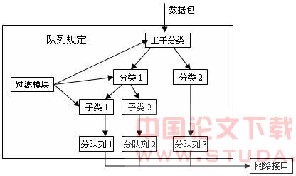 TC共分为三个模块:队列规定模块、分类模块和过滤模块。它们之间的关系如图1所示,队列规定模块是TC实现的基础,在这个模块中封装了其它两个模块。而分类和过滤规则是实现TC的主体。2.1.1 队列
