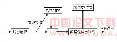 TC在系统中的具体位置如图2所示,数据包流入系统后,进行路由选择:如果接收包的目的IP是本主机,那么将该包送给上层处理;否则需要进行转发,将接收包交到转发模块处理。转发模块同时也接收本主机上层(TCP/UDP等)产生的包。转发模块通过查看路由表,决定包的下一跳。然后,对包进行排列以便将它们传送到输出接口。TC正是在排列数据包时进行处理和实现的。