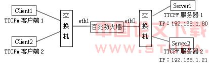 TTCPW是Windows下的网络性能(主要指吞吐量)测试工具,采用P2P模式。从一端内存生成要传送的数据,通过网络传送后,由另一端收下来。数据包接收后无需写到磁盘,直接丢弃,既方便,又实用,更不受磁盘读写速度的影响,测试结果比较真实。下面,我们通过它来测试上面的实例,并给出相应的测试结果。测试环境如图4所示,网络环境是百兆的局域网。