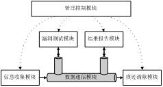 系统分为六大模块:管理控制模块、信息收集模块、漏洞测试模块、结果报告模块、痕迹清除模块、数据通信模块。系统架构图如图2所示。