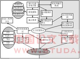 对上面提到的每种测试对象,均有一些不同的测试手段,如果较为有序而有效的完成所有测试,应将一次完整的渗透测试拆分成以下这些要素:网络勘查、端口扫描、系统识别、无线网漏洞测试、服务探测(网站信息、Mail信息、名字服务、防病毒木马)、漏洞精确扫描、溢出搜寻、漏洞测试和确认、应用程序测试、防火墙和访问控制测试、入侵检测系统测试、文件服务测试、社会工程学测试、口令破解、拒绝服务测试、Cookie和网页Bug分析。这些要素在一次渗透测试中的组织关系如图1所示:
