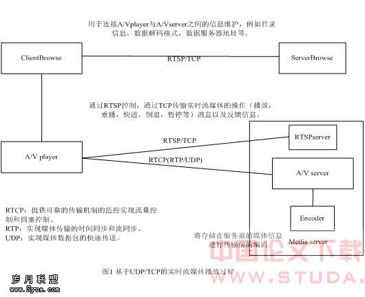 因此对于流媒体在传输层协议上的选择,适用的传输机制就是TCP和UDP的互补,控制信息通过TCP进行传送,数据信息通过UDP进行传送。或是在应用层通过RTP,RTCP等协议规范,然后由UDP负责流媒体信息再补传输层的传输。 如图1,传统的基于UDP/TCP的流媒体传输机制,由于TCP/UDP传输协议对流媒体实时播放的支持不足。需要通过大量其他协议的合作部署才能支持实时流媒体的点播和播放。但是通过整合多个辅助传输协议的流媒体传输方案需要通过大量控制信息的交互作为实现的代价。特别是在媒体信息传输这个传输机制中,调用RTP进行流媒体数据传输中的时间同步和流同步的实现。但是RTP由于并不能提供流量控制和拥塞控制的操作,使得必须还要通过RTCP协议进行对数据传输的监控。而为了维护RTCP对流量控制和拥塞控制的功能,则要通过周期性的发送RTCP数据包,进行对RTP流媒体数据包的发送数量,丢包数量等网络传输性能信息的统计。这样的传输机制使得网路中真正传输的实时流媒体信息率降低,并可能导致网络传输性能的统计信息包和流媒体数据信息包对有限网络带宽在发生拥塞情况时产生竞争,加剧网络的拥塞。同时由于在传输层是通过基于不可靠传输的UDP协议机制,使得对流媒体信息中要求可靠有序的信息需要通过传输播放控制信号的RTSP/TCP传输通道。