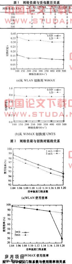 由表1可知,对于从WLAN切换到WiMAX的情况,随着网络负荷的增加,LGD方式的丢包数在2-5之间,LD方式在7-10之问。对于从WiMAX切换到UMTS的情况,随着网络负荷的增加,LGD方式和LD方式都未出现丢包现象由图3可知,随着功率强度门限系数变大,MN在2种速度下的网络使用效率都降低。对于从WLAN切换到WiMAX的情况,1rn/s时WLAN的使用效率比5m/s时略高对于从WiMAX切换到UMTS的情况,1m/s时WiMAX的使用效率与5m/s时接近,而在功率强度门限系数为1.2时,1m/时的使用效率大幅度降低,此现象是由仿真的偶然性造成的。