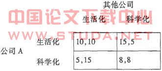 图中数字表示客户的数量比例的数字抽象,由这个博弈模型可看出,其均衡为公司A选择生活化,即无论其他公司选择哪种分类法,公司A选择现行的网络分类法均能拥有最大化的市场占有率。