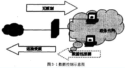 电子政务系统的数据控制主要目的是阻止攻击者利用政务系统的管理主机作为跳板去攻击别的机器,但是只是尽量的减少,而不是杜绝这种行为。当然,针对政务内部任何的扫描、探测和连接管理主机是允许的,但是对从主机出去的扫描、探测、连接,网络安全系统却必须有条件的放行,如果发现出去的数据包有异常,那系统管理员必须加以制止。数据控制示意图如图3—1所示: