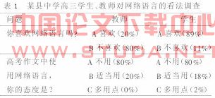 为了了解学生和以教师为代表的教育工作者对网络语言的看法,有人对华东地区某县级市第一中学高三学生和10位高三毕业班的语文老师进行了一次调查。部分调查结果如表1: